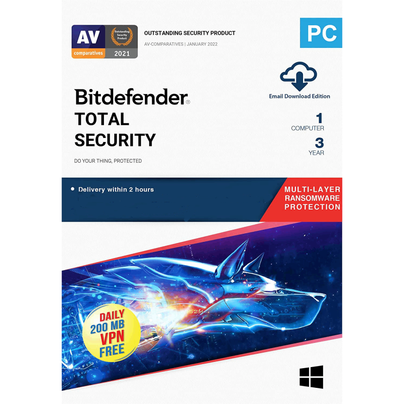 Multi-Layer Ransomware Protection with Bitdefender Safe Files, Bitdefender VPN(200 MB free daily traffic), video & audio protection, Ransomware Remediation, Anti Tracker.