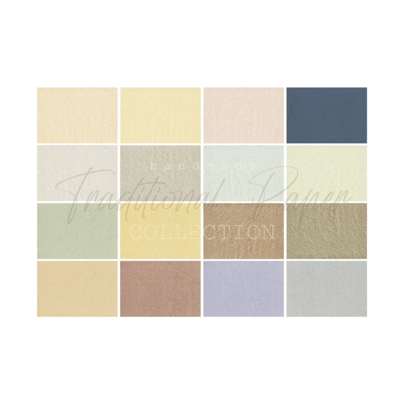 This package; Contains 40 traditional papers made by hand and traditional methods. These papers have a very high texture ratio and are quite different from fabricated papers. Natural materials such as sawdust and bark are boiled and crushed, After a grueling series of processes, traditional paper is obtained. You can easily see the bark fibers, which are as thin as a hair in the texture of the paper.