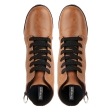 • A pair of black/Brown/tan/Grey round toe heeled boots, has high-top styling, lace-ups detail